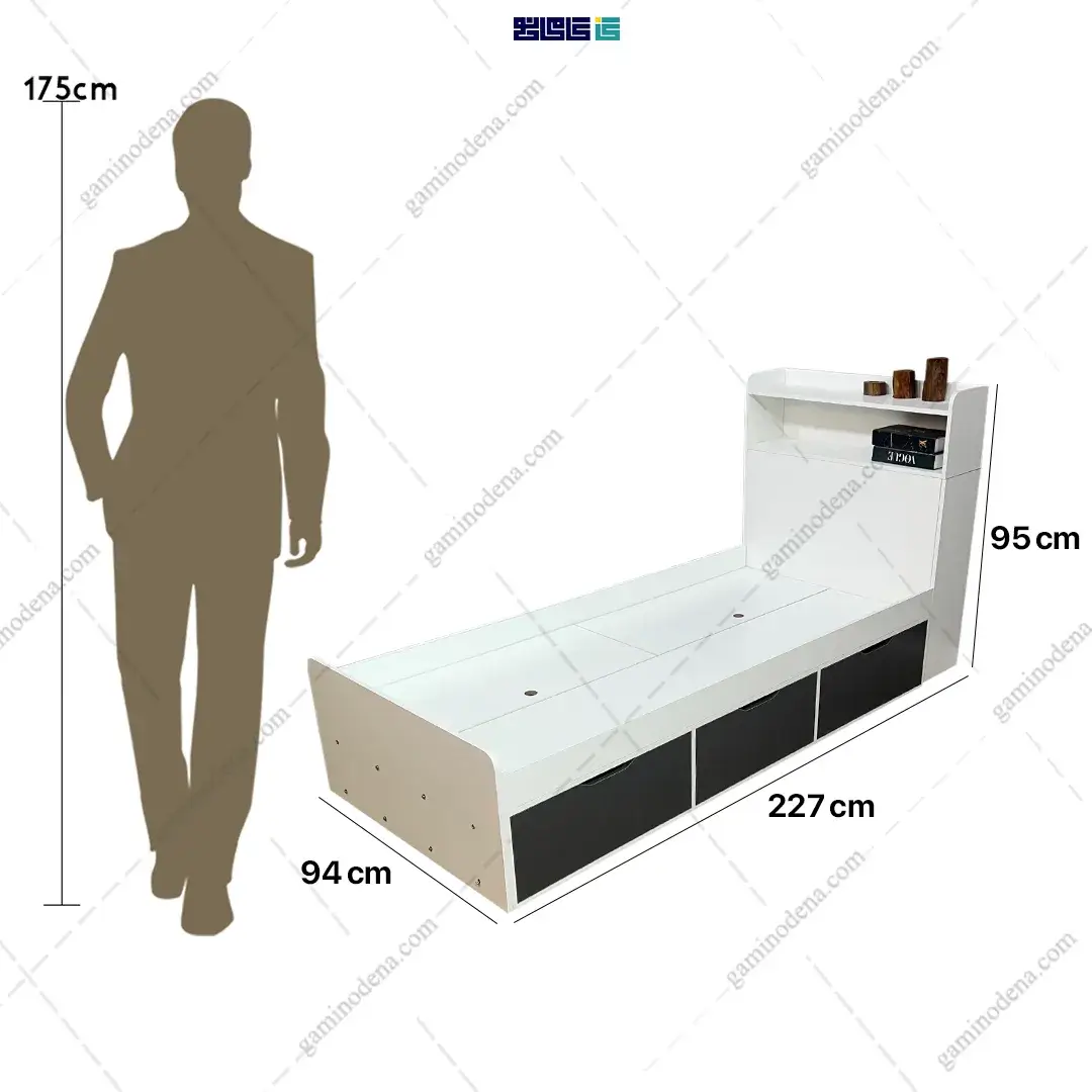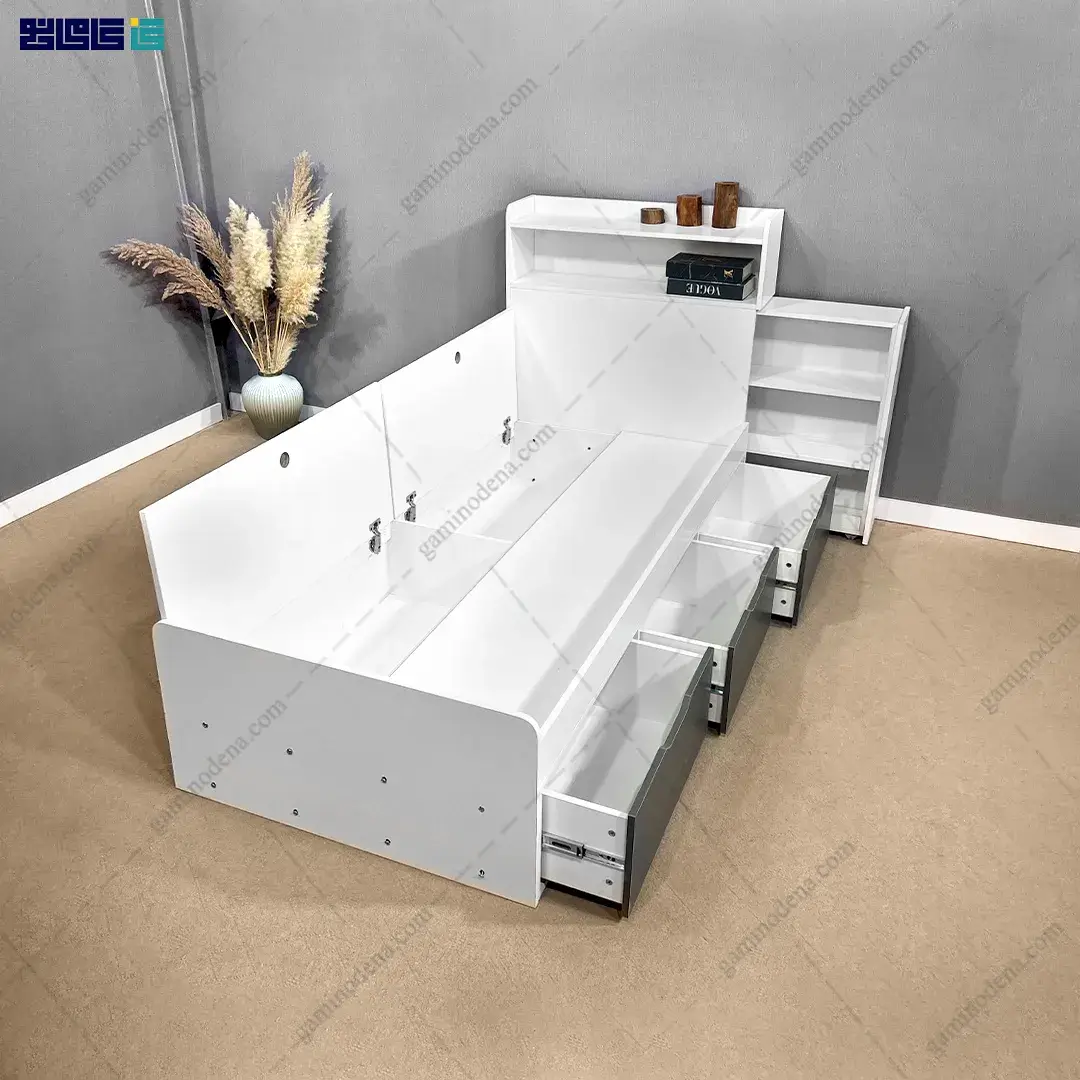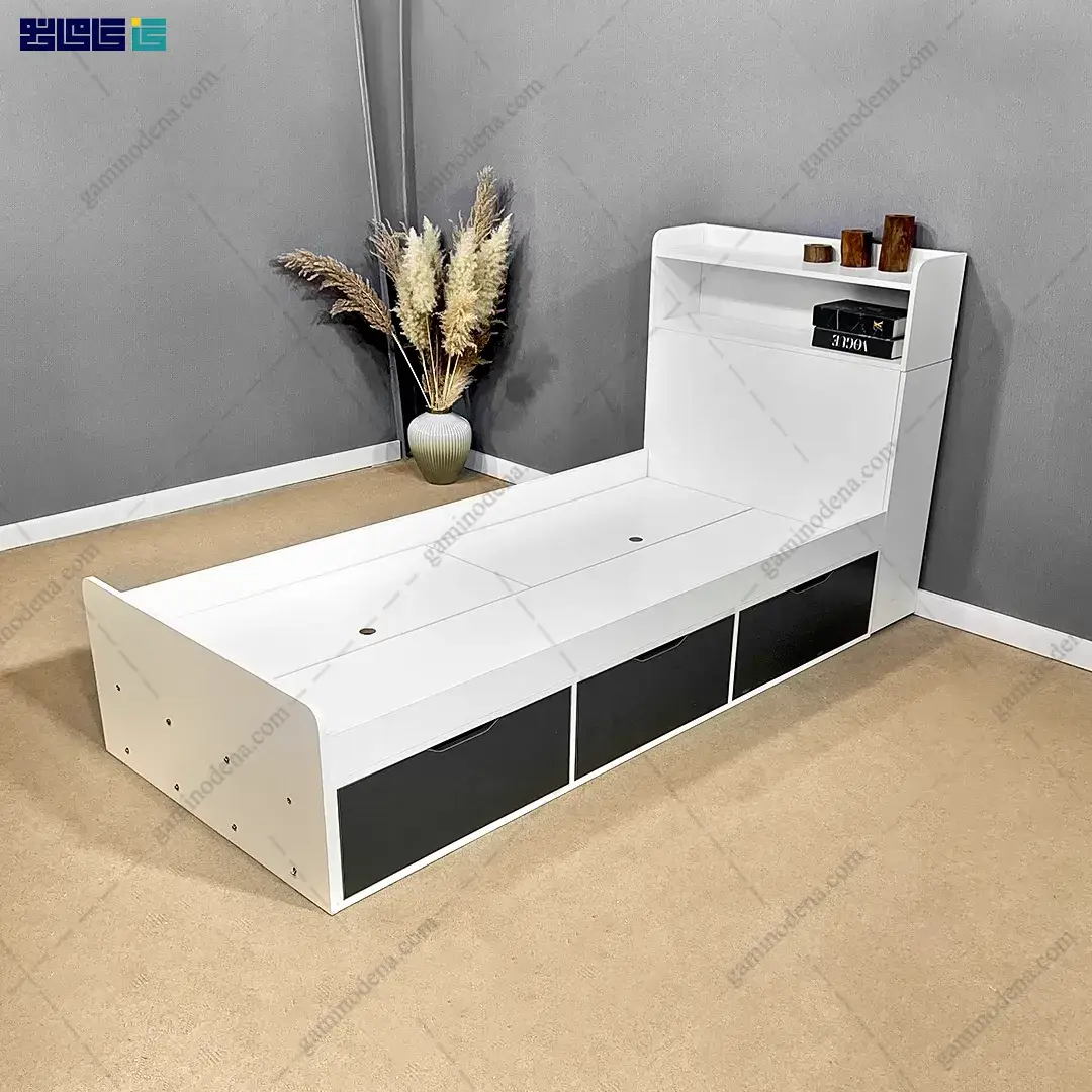 تخت خواب یک نفره کیان دارای چندین کشو کاربردی میباشد. همچنین کف تخت خواب قابلیت کمد شدن را دارد و بسیار جادار میباشد.تخت خواب یکنفره کیان بخاطر طراحی منحصر بفرد خود انتخاب خوبی برای اتاق های کوچک و کمجا میباشد.همچنین دارای دو قفسه میباشد که میتوان به عنوان کتابخانه استفاده بهینه کرد.