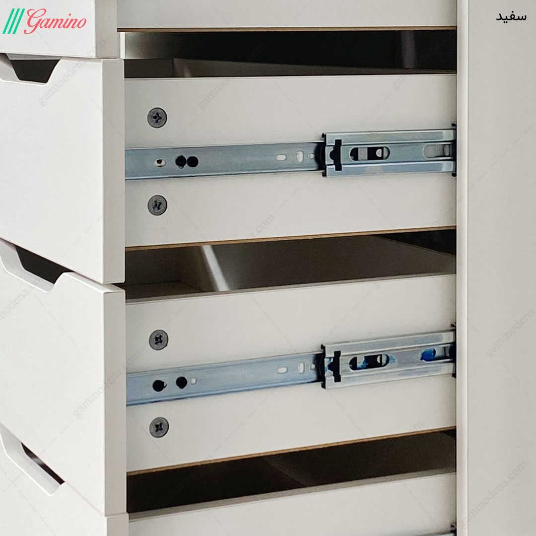- ریل استفاده شده در کشو ها از نوع پهن، سه تیکه، ساچمه ای و فلزی