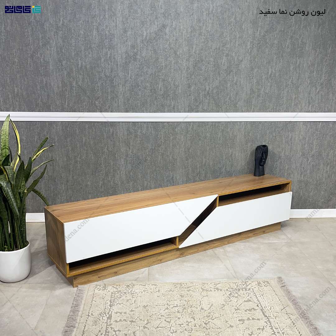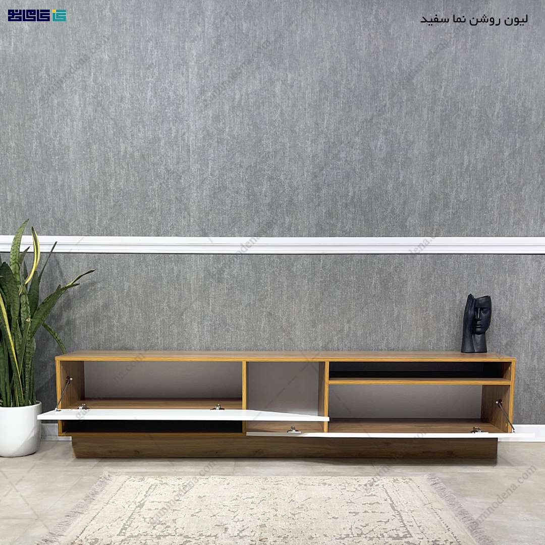 • در طراحی این میز تلویزیون دو عدد درب کمدی وجود دارد که به صورت داشبوردی باز و بسته می شود.