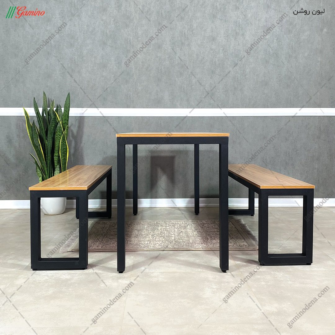 میز غذا خوری دنا ساخته شده با ام دی اف ضدخش برای صفحه میز و پروفیل های 60 * 40 با رنگ کوره ای مشکی برای چارچوب آن است که تلفیق چوب و فلز زیبایی آن را چند برابر نموده است. این محصول دارای نیمکت است که فضای مناسبی را برای نشستن فراهم میکند. روی هر نیمکت 3 نفر میتوانند بدون مشکل بنشینند. میز بسیار فضای کمی را اشغال میکند و شما پس از صرف وعده مورد نظر میتوانید نیمکت ها را زیر میز قرار داده تا مانع رفت و آمد نباشند.