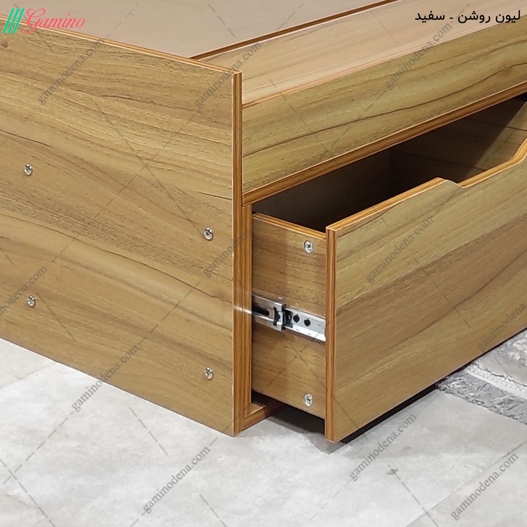 پاسخ: ماده اولیه تخت خواب از جنس ام دی اف با دانسیته بالا است که با پی وی سی یک میل روکش شده است. کفی کشو از فیبر سه میل و کفی تشک از نئوپان خام است.