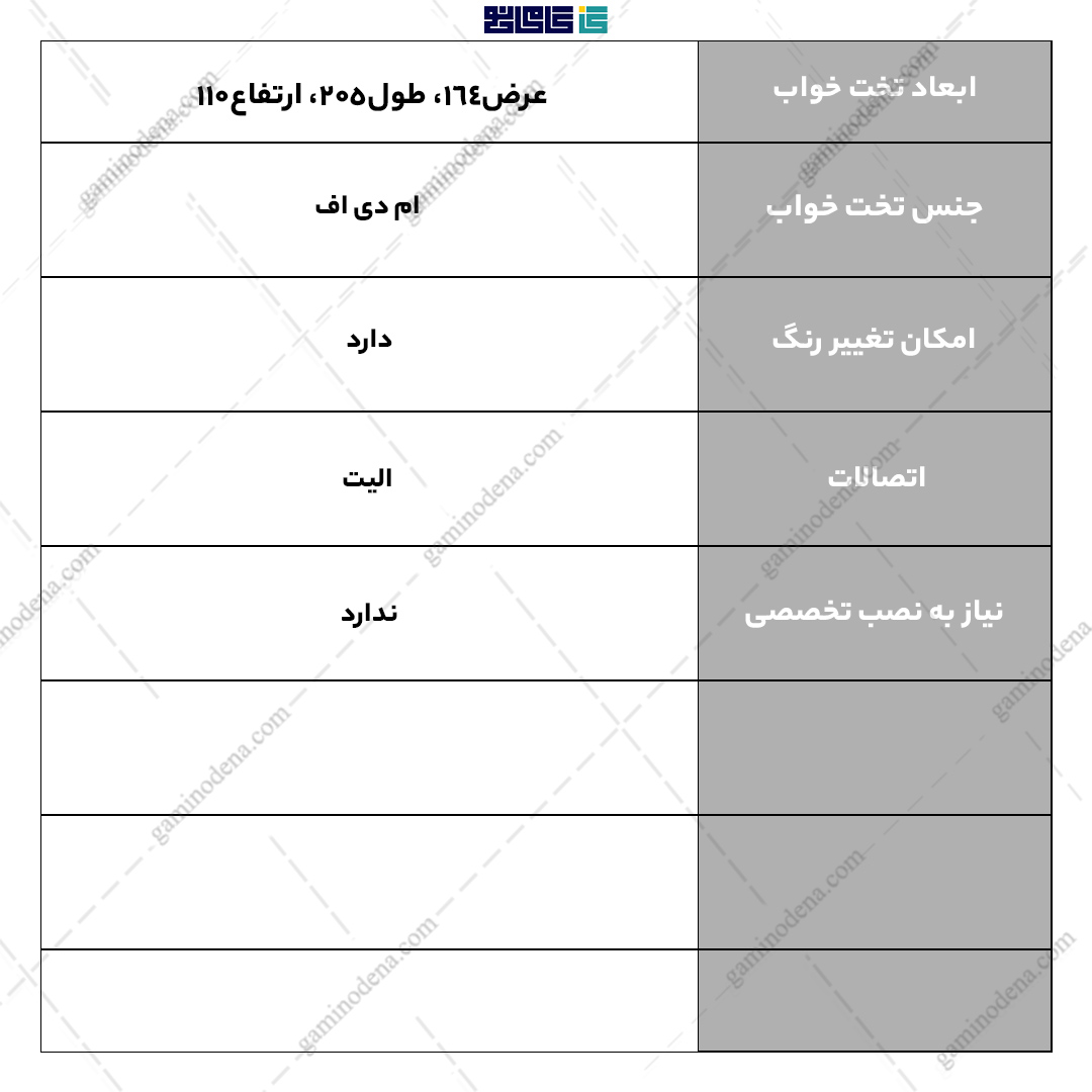 - ابعاد تخت : عرض 164 * طول 205 * ارتفاع 110 سانتی متر