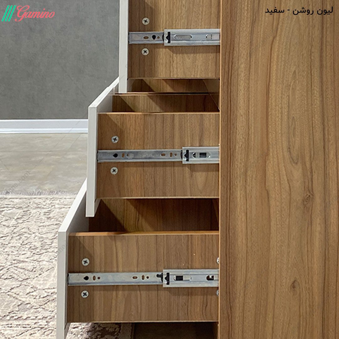 - ریل استفاده شده در کشو ها از نوع پهن، سه تیکه، ساچمه ای و فلزی