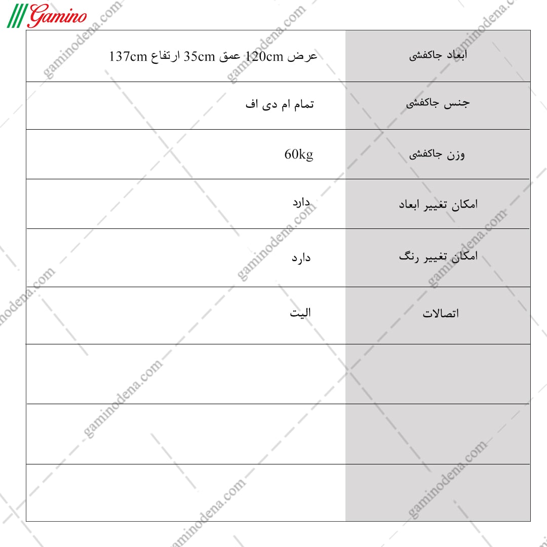 - ابعاد جاکفشی: طول 120 عمق 35 ارتفاع 137 سانتی متر