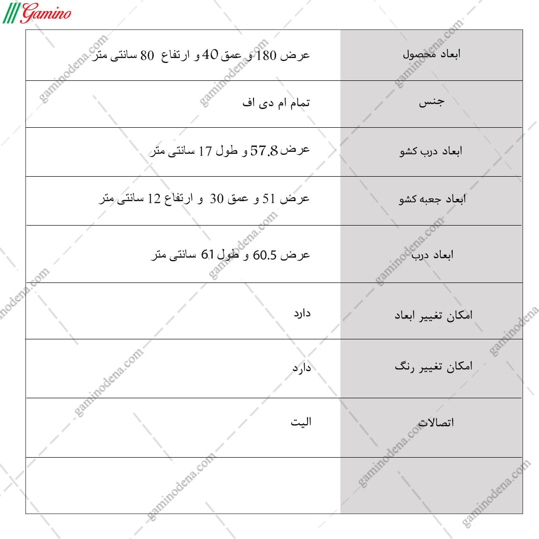 - ابعاد محصول : طول 180 عمق 40 و ارتفاع 80 سانتی متر است
