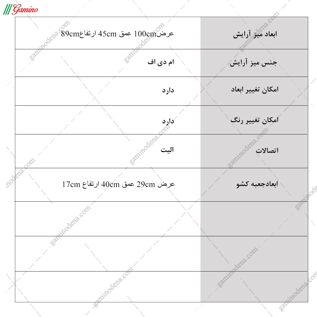 - میزآرایش از یک صفحه و 3 کشو ساخته شده است.