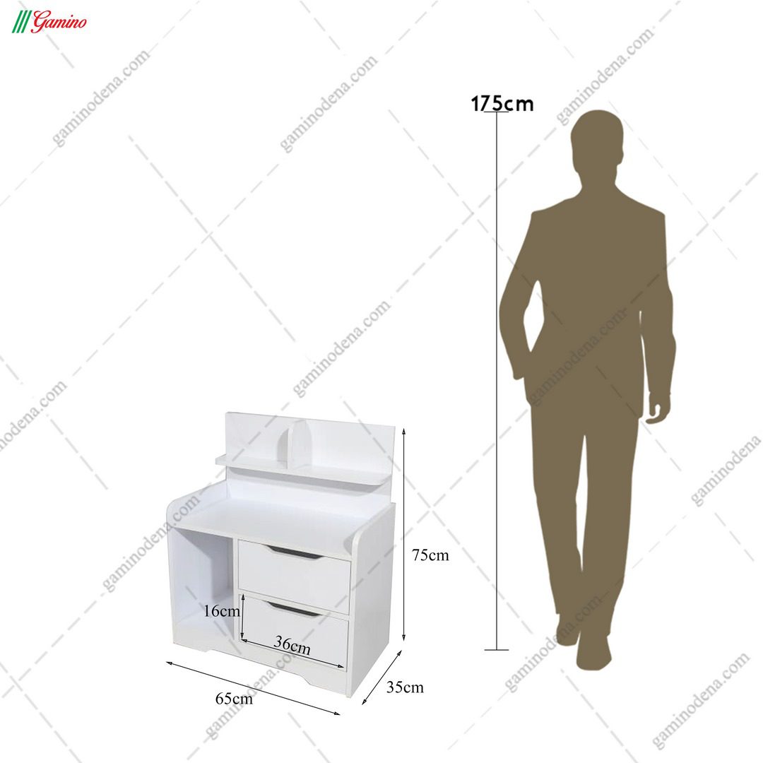 این میز در بخش بالایی دارای یک شلف است و نیز دارای 2 عدد کشو و یک باکس می باشد تا به شما در قرار دادن وسایلتان کمک کند.