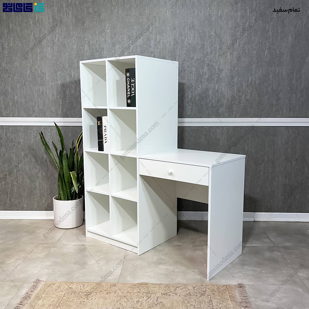 - در سمت چپ میز یک کتابخانه با 8 باکس طراحی گشته است.
