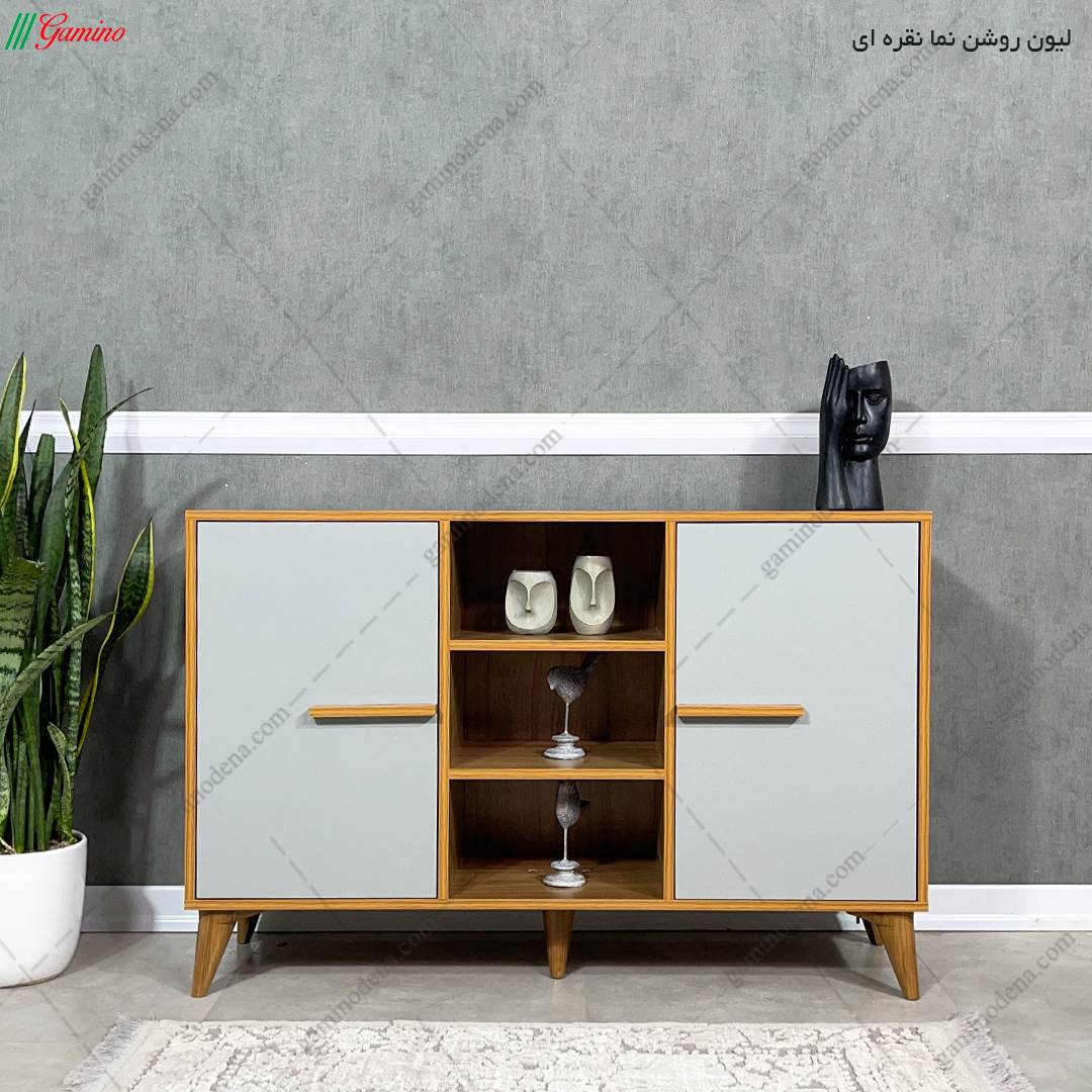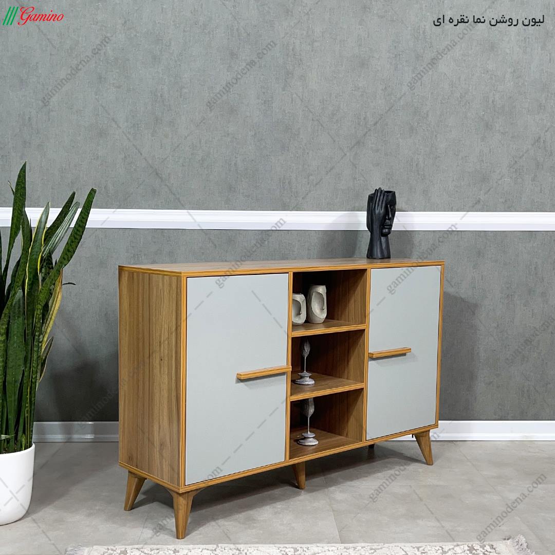 - این میز شامل 2 درب کمدی که در بخش سمت راست و چپ قرار گرفته و یک باکس یا فضای بدون درب طراحی گشته است.