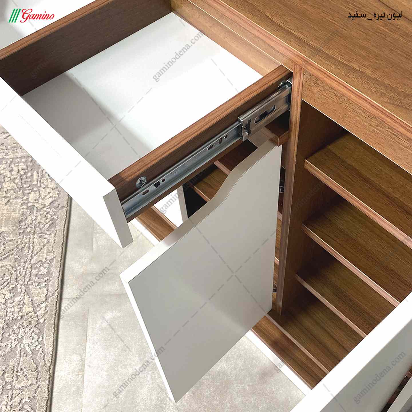 - کمد سمت چپ توسط 2 طبقه به 3 بخش تقسیم شده است