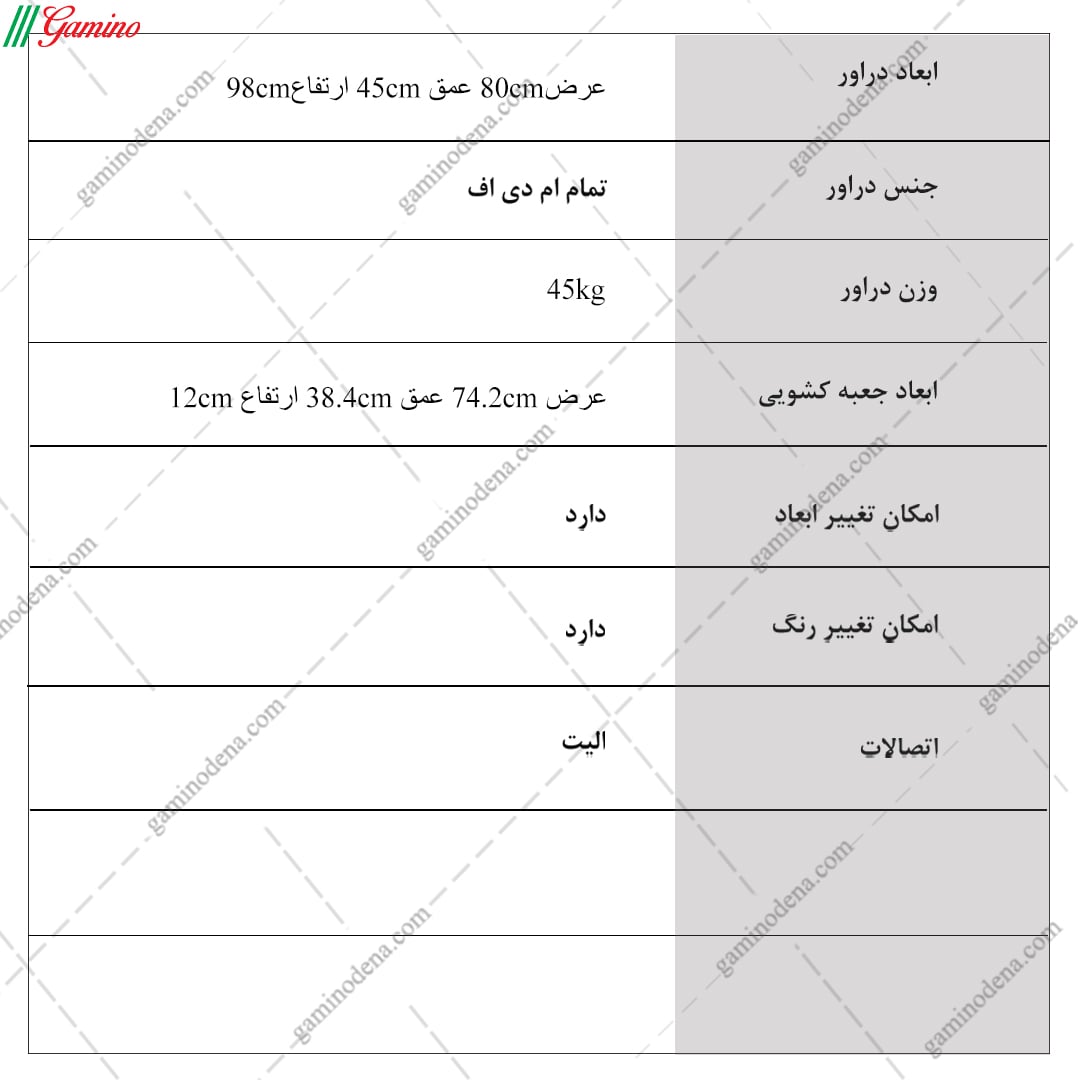 این دراور دارای 4 کشو ریلی می باشد که که دستگیره های آن با دستگاه سی ان سی برش خورده است، پشت دستگیره ها ورق ام دی اف با رنگ متمایز، این دراور را منحصر به فرد نموده است.