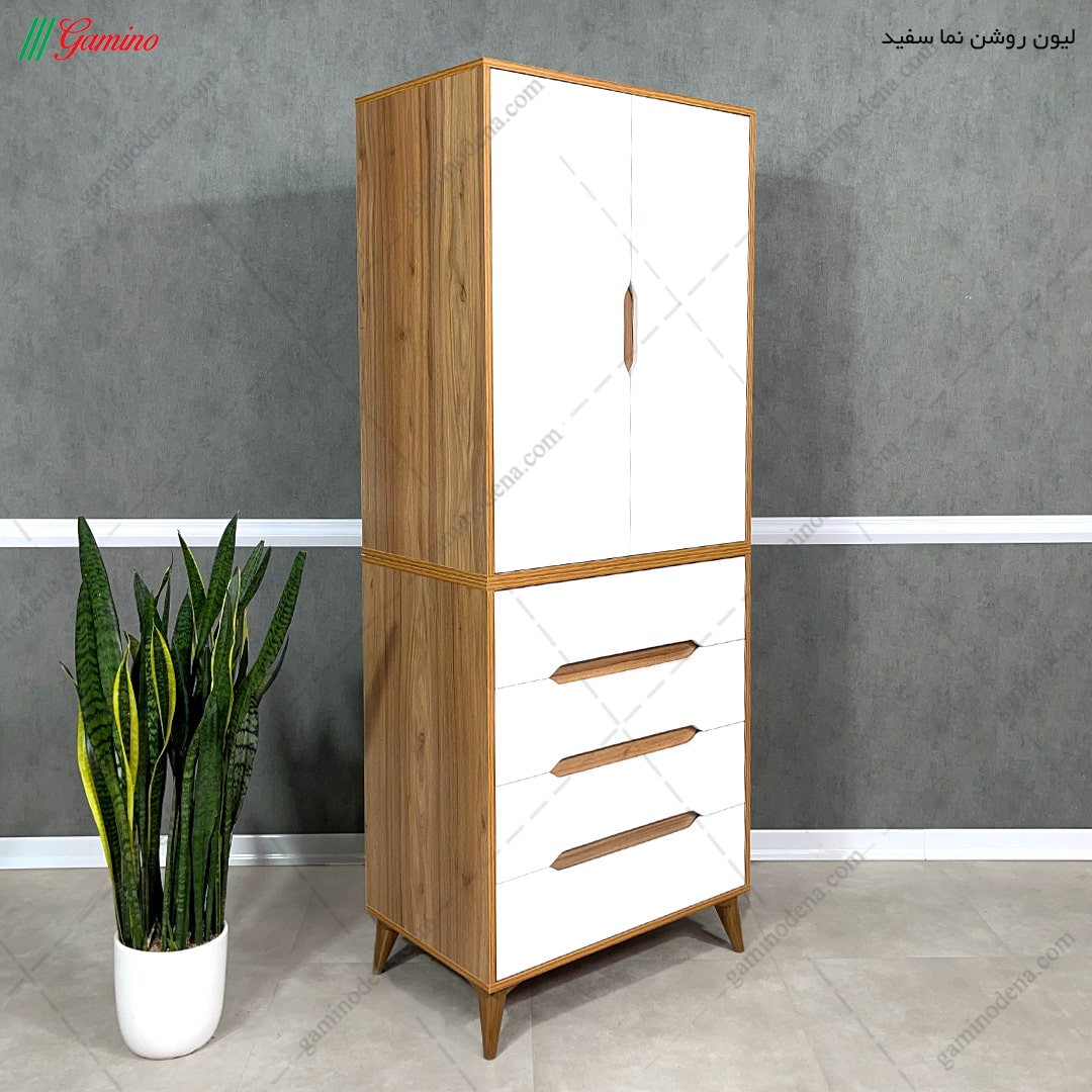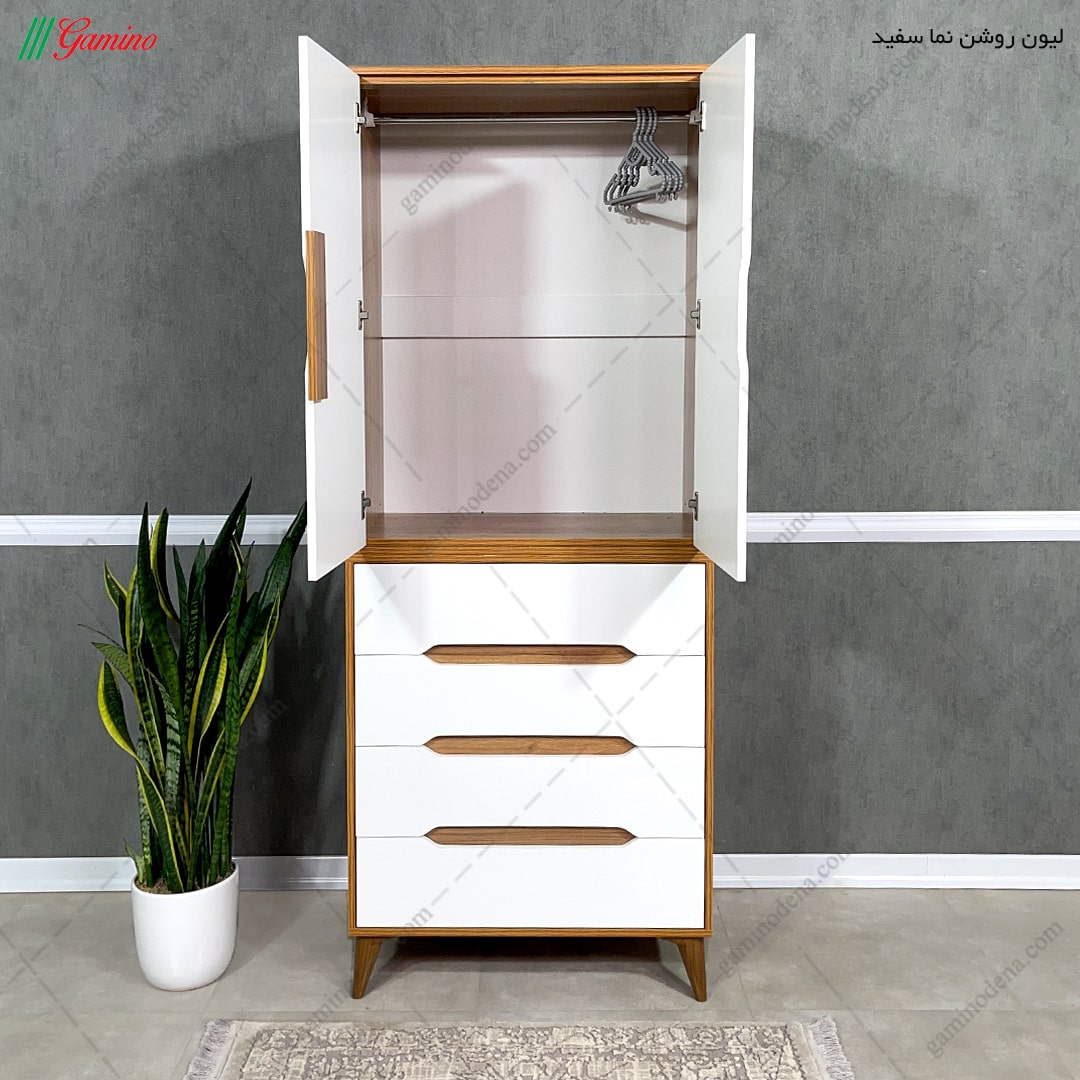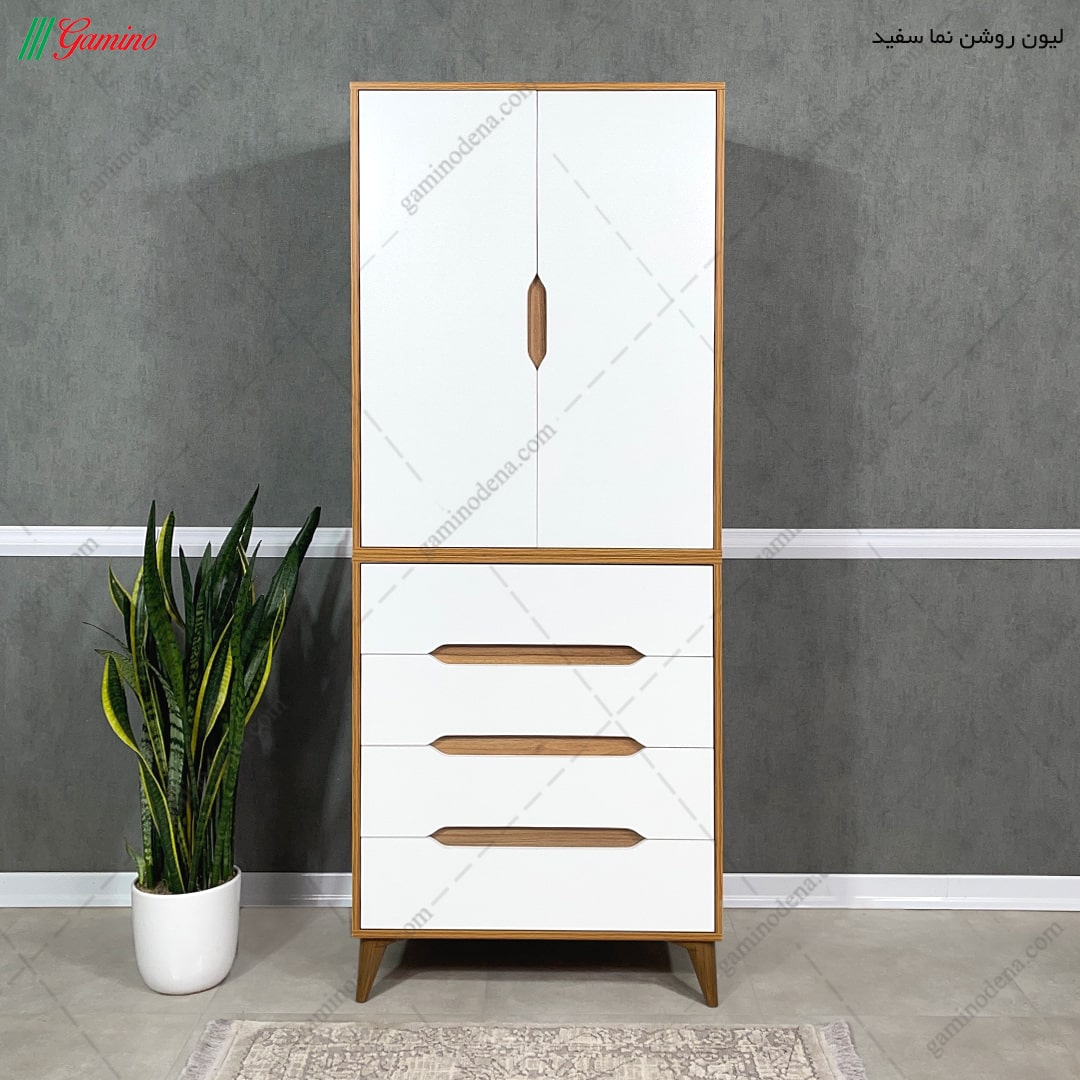 از ترکیب رنگ سفید و لیون تیره در طراحی کمد لباس K109 استفاده شده است. بهطوریکه میتوان در کلیت کار رنگ سفید را مشاهده کرد و در قسمت پایهها و پشت دستگیره دربها و کشوها رنگ لیون روشن به چشم میخورد. رنگهای به کار رفته در این محصول کنتراست خوبی را ایجاد کردهاند و به زیبایی هر چه بیشتر کمد افزودهاند. شما عزیزان می توانید این محصول را با دیگر لوازم منزل خوذ از جمله؛ میز تحریر ساده و یا میز آرایش مدرن خود ست نمائید.