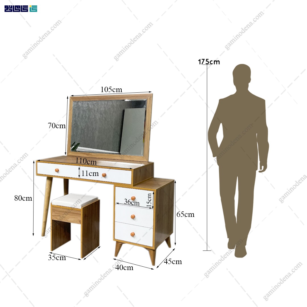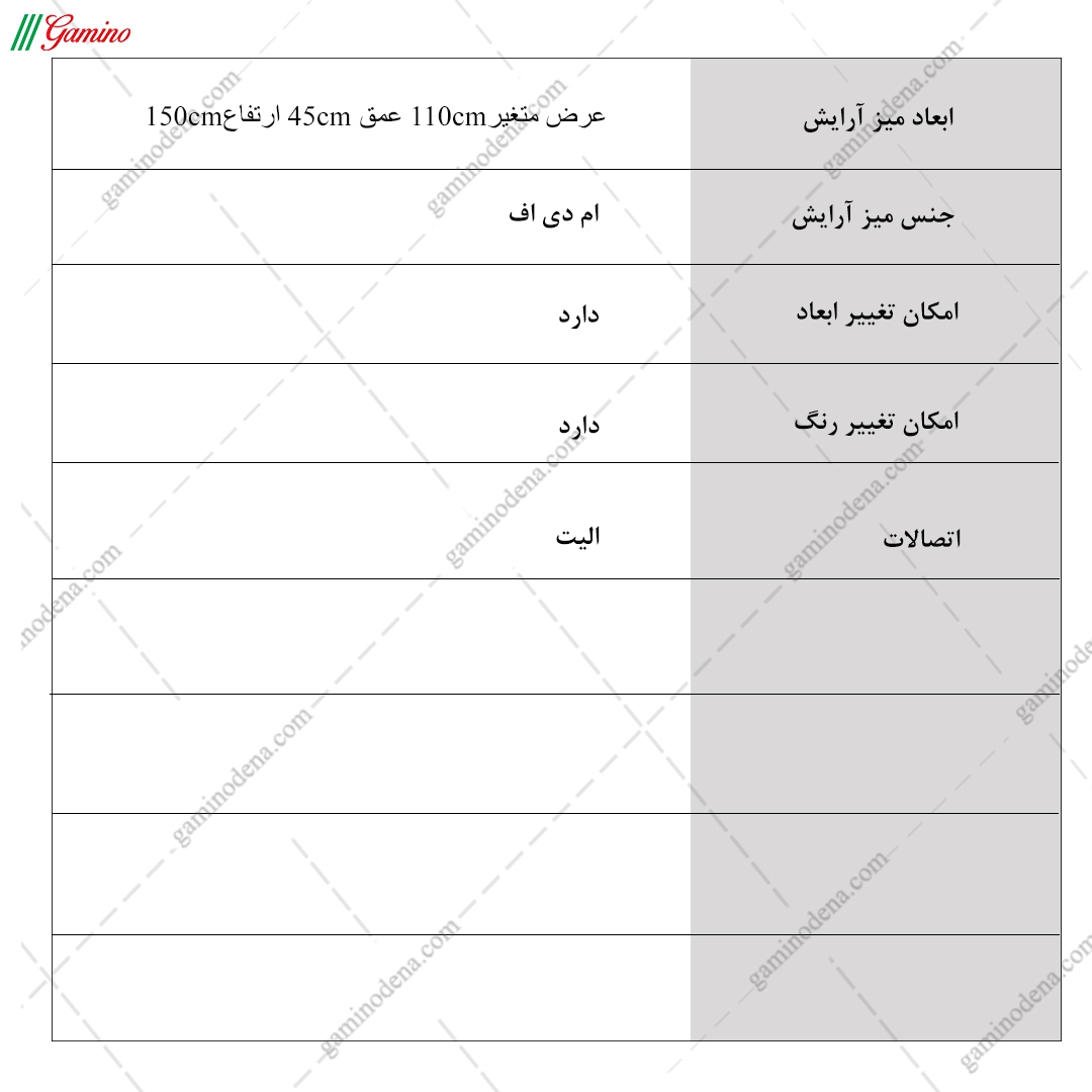 پاسخ: به دلیل اینکه تمامی محصولات، تولید خود گامی نو دنا می‌باشد برای میز آرایش نیز امکان انتخاب رنگ و ابعاد محصول توسط مشتری وجود دارد و می‌توانید به صورت حضوری و یا غیر‌حضوری از طریق تماس با واحد فروش از این موضوع اطمینان حاصل کنید.