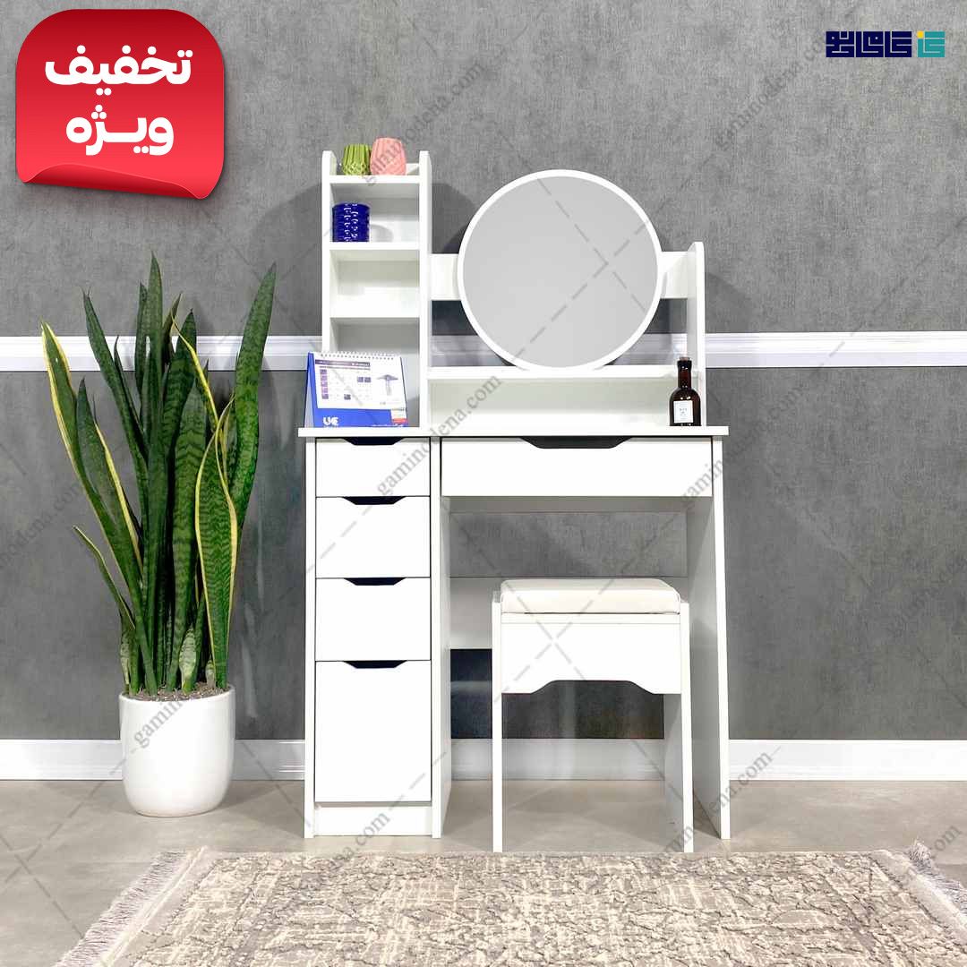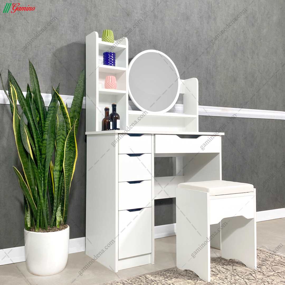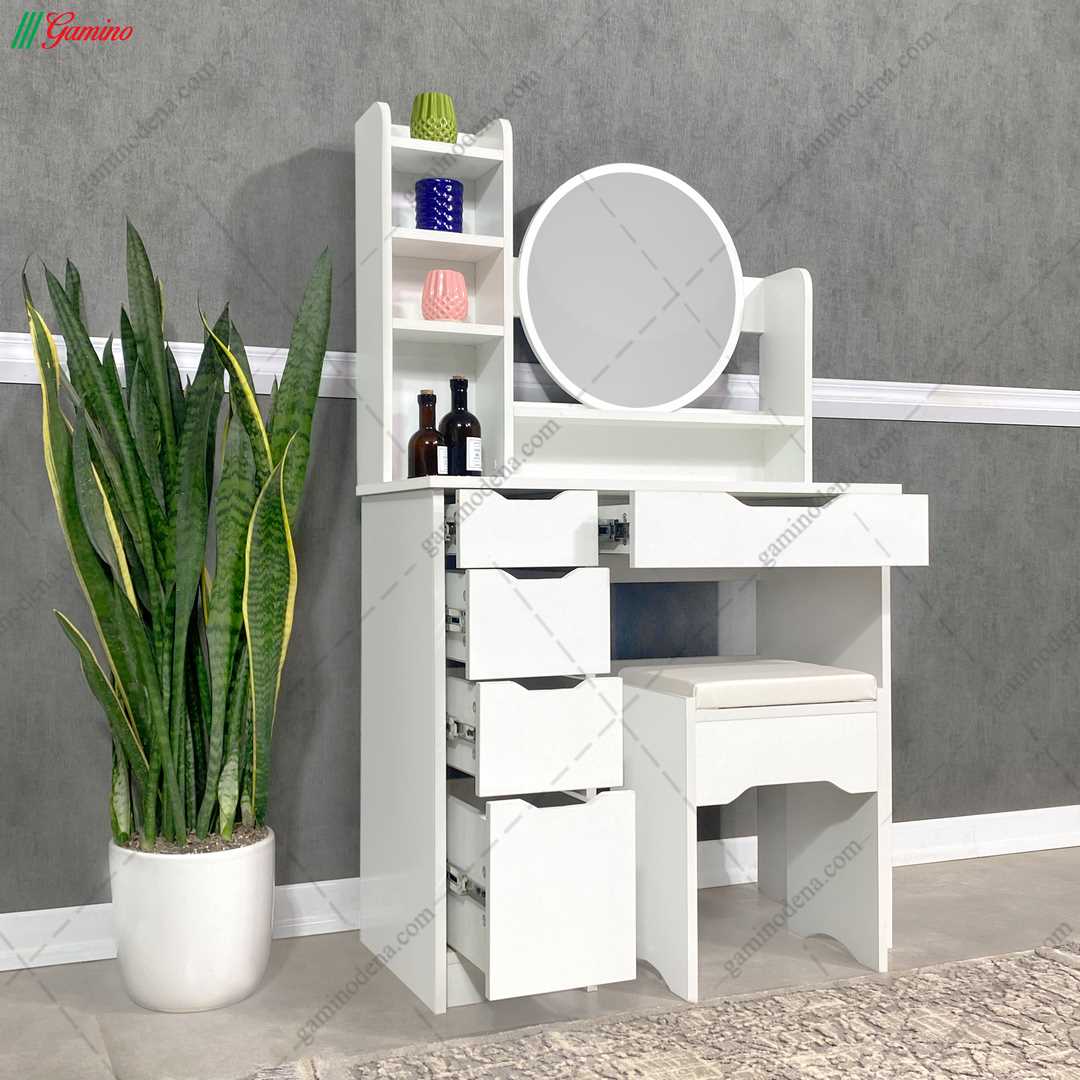 این میز آرایش دارای 4 کشو با عرض کم و یک کشو عریض زیر میز است که با طبقات روی میز کامل میشود و همراه یک آینه گرد زیبا عرضه می شود.