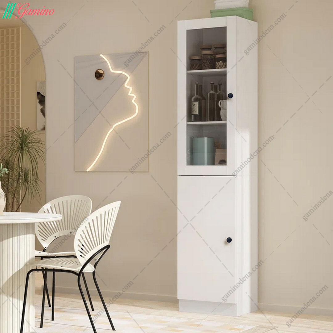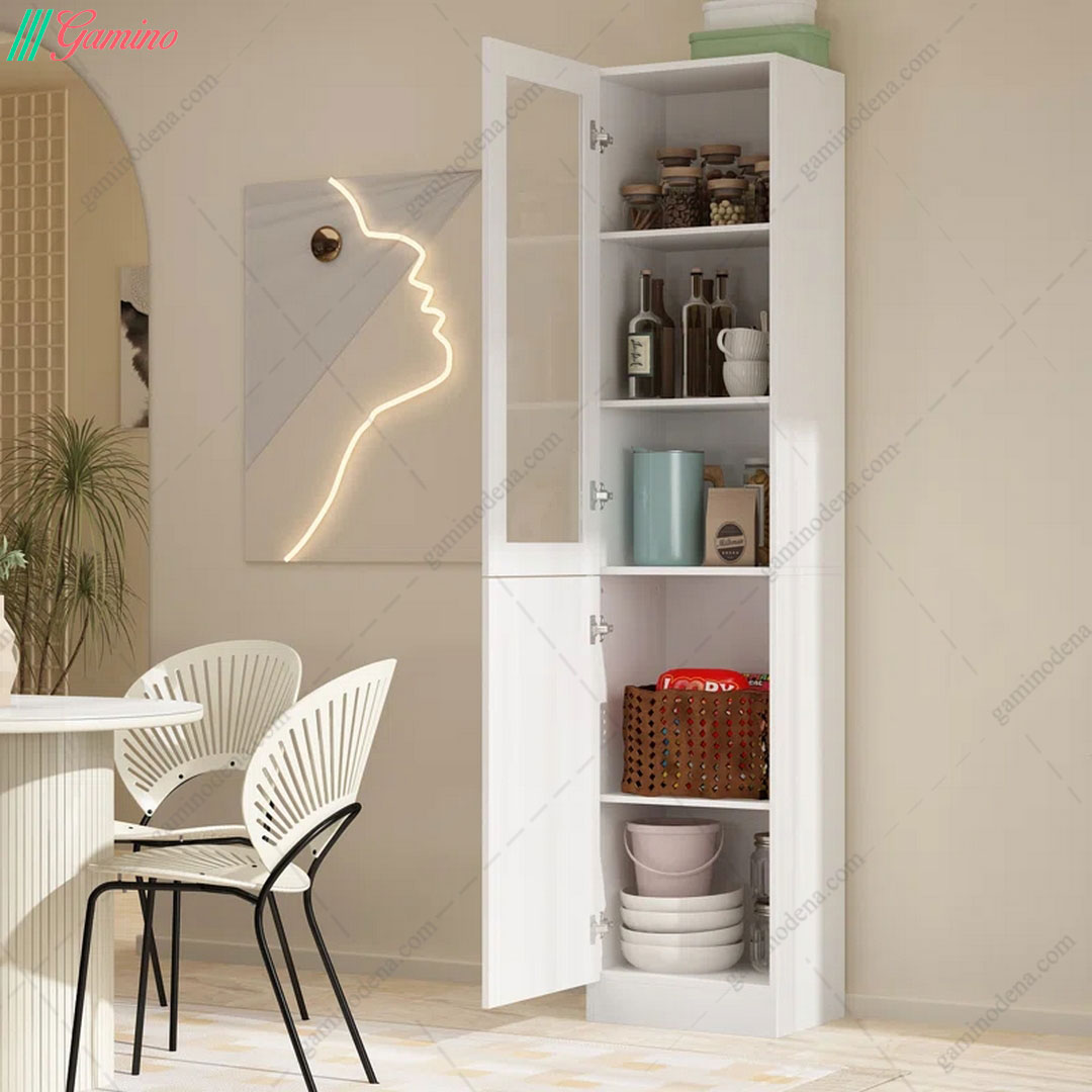 - کمد بالایی نیز بر روی درب آن یک شیشه نصب گردیده است. و شامل 3 بخش میباشد.