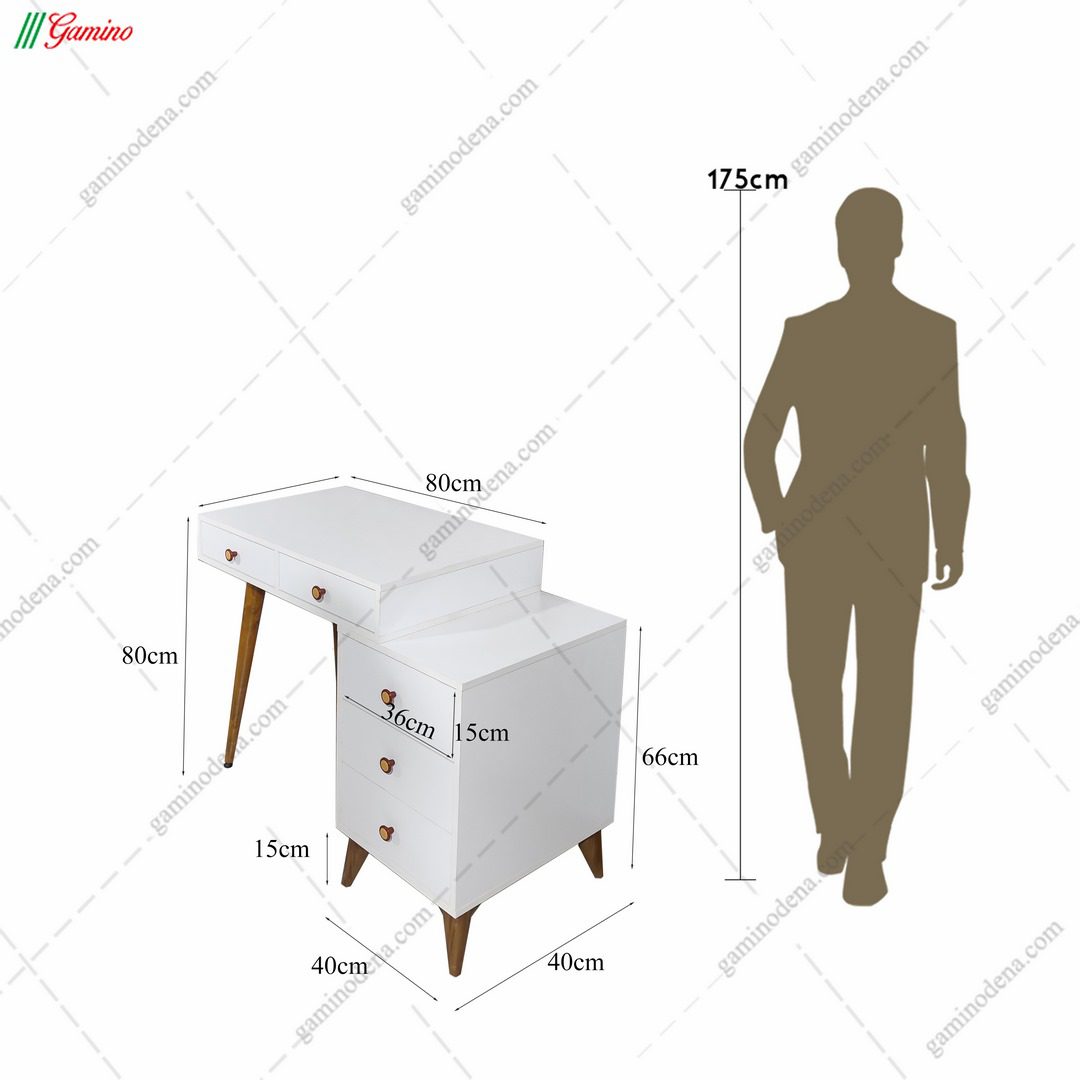 این میز به صورت دو تکه ساخته شده است به همین خاطر هم قابلیت زیاد و کم شدن عرض محصول وجود دارد. این قابلیت به شما این امکان را می دهد تا این میز را در فضای خانه خود به راحتی جای دهید. بخش میز دارای 2 کشو و بخش فایل دارای 3 کشو است. همراه این محصول یک آینه گرد با قطر 75 نیز موجود است.