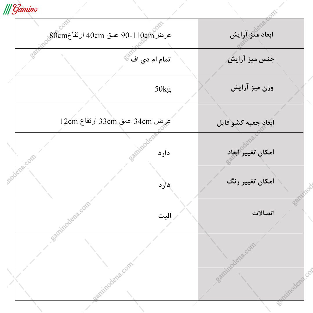 پاسخ: به دلیل اینکه تمامی محصولات، تولید خود گامی نو دنا میباشد برای میز آرایش نیز امکان انتخاب رنگ و ابعاد محصول توسط مشتری وجود دارد و میتوانید به صورت حضوری و یا غیرحضوری از طریق تماس با واحد فروش از این موضوع اطمینان حاصل کنید.
