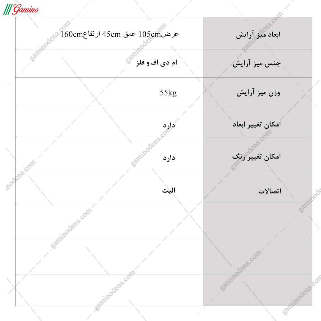 پاسخ: به دلیل اینکه تمامی محصولات، تولید خود گامی نو دنا میباشد برای میز آرایش نیز امکان انتخاب رنگ و ابعاد محصول توسط مشتری وجود دارد و میتوانید به صورت حضوری و یا غیرحضوری از طریق تماس با واحد فروش از این موضوع اطمینان حاصل کنید.