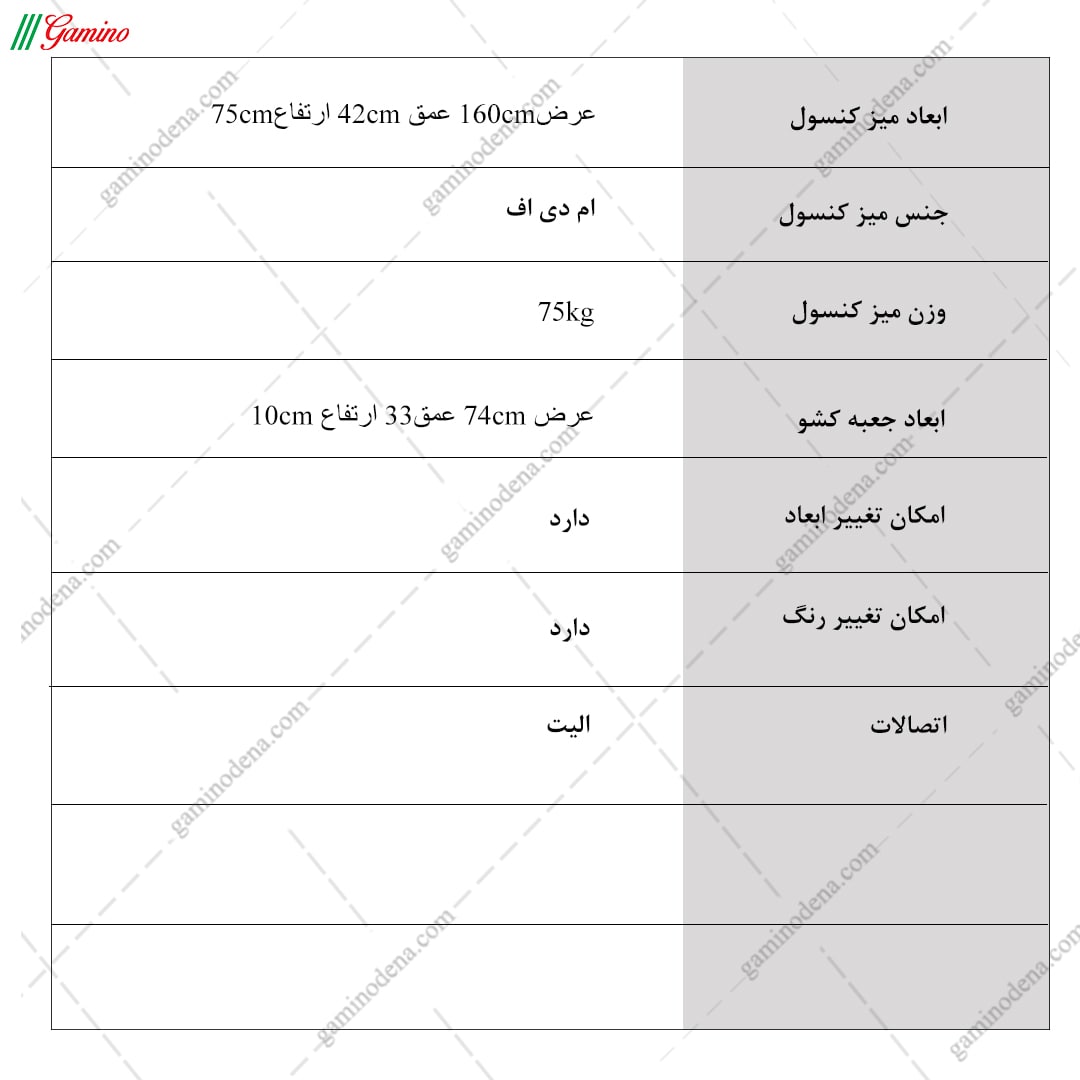 پاسخ: به دلیل اینکه تمامی محصولات، تولید خود گامی نو دنا میباشد برای کنسول نیز امکان انتخاب رنگ و همینطور ابعاد و تعداد کشوهای محصول توسط مشتری وجود دارد و میتوانید به صورت حضوری و یا غیرحضوری از طریق تماس با واحد فروش از این موضوع اطمینان حاصل کنید.
